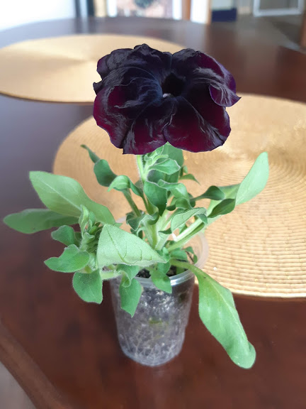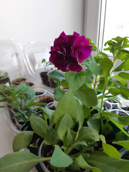 Первой зацвела петуния "Бургунди". Я решила посмотреть, как она цветет и соответствует ли описанию бутон. Да и для высаживания было еще холодно. Очень красивые пышные цветы и сильный аромат. Из 10 семян взошло 8.